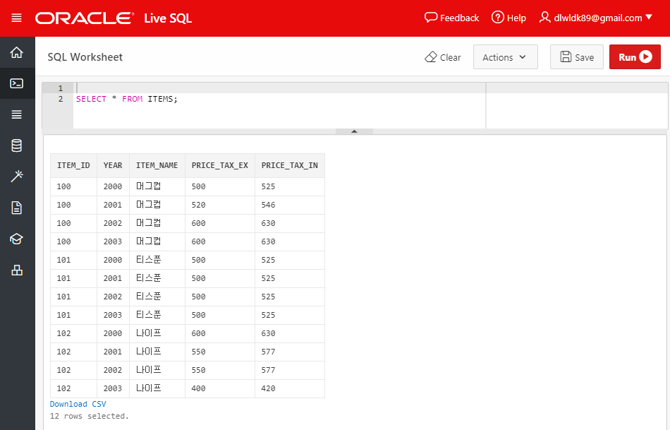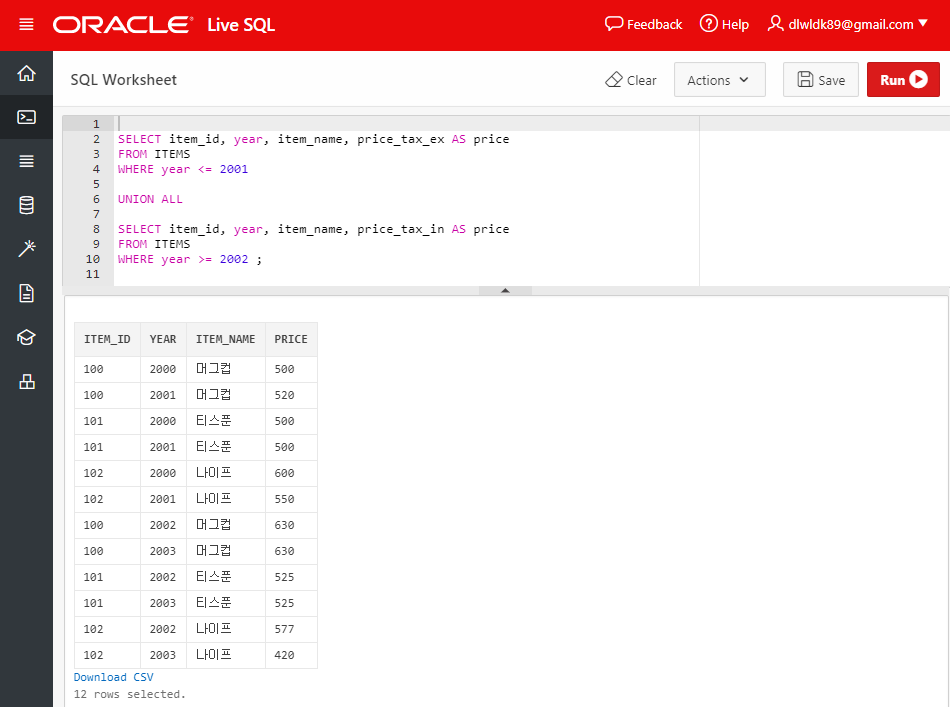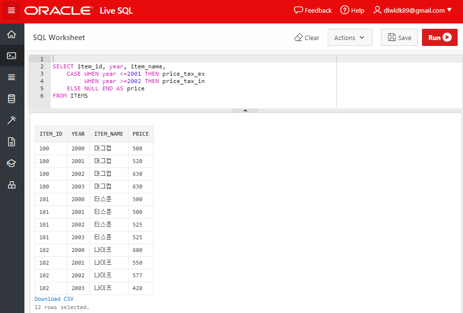 ITEMS 테이블에서 PRICE_TAX_EX는 세전 가격을, PRICE_TAX_IN은 세후 가격을 나타낸다. 우리가 보고자 하는 결과 테이블에서는 2001년 이전의 물품 가격은 PRICE_TAX_EX(세전 가격)으로, 2002년 이후의 물품 가격은 PRICE_TAX_IN(세후 가격)으로 추출되는 PRICE 컬럼을 만들어내는 것이다.