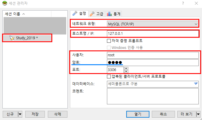 세션의 이름과 네트워크 유형을 정한뒤, 접속할 DB의 IP, User ID, PW, Port 정보 등을 입력하면 로컬 DB 뿐만 아니라 외부 DB 서버까지 연동이 가능하다.