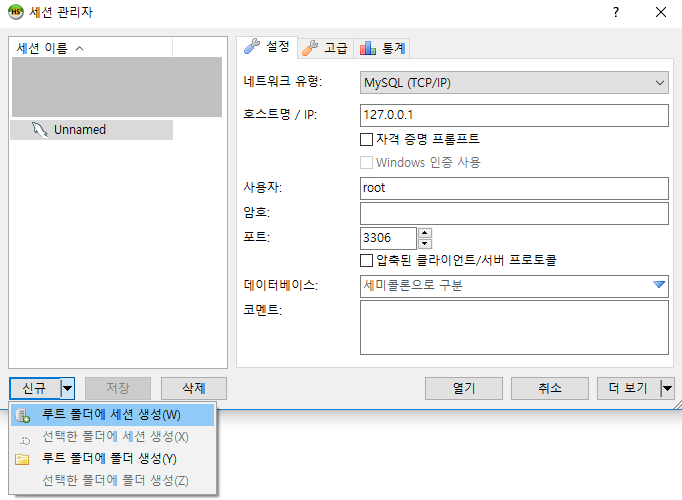 새로운 세션을 만들기 위해 아래의 그림과 같이 [신규 > 루트 폴더에 세션 생성] 탭을 클릭해주면 위와 같은 Unnamed 된 세션이 생성된다. 세션의 이름은 오른쪽 마우스를 클릭하여 [Rename]하면 된다.