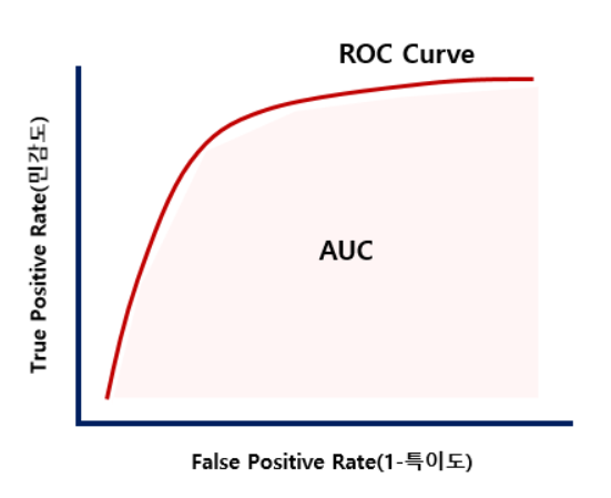 랜덤수준의 데이터 셋에서는 AUC가 0.5이며, 1에 가까워 질수록 모델의 하이퍼 파라미터(임계값)가 좋은 성능을 낸다는 뜻이다.