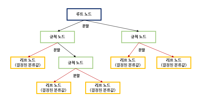 - 규칙 노드(Decision Node) : 분할의 규칙이 명시되어있는 규칙 조건이 담긴 노드이다.