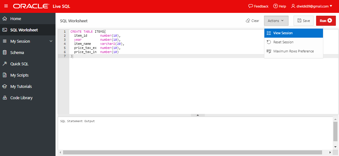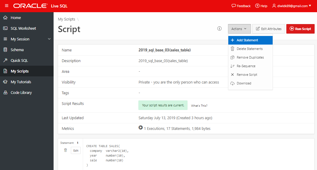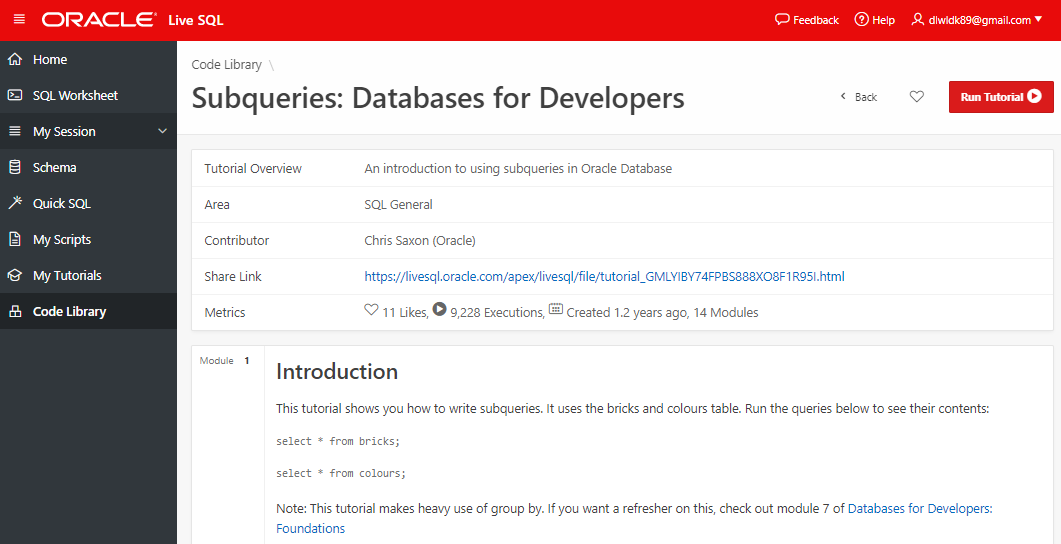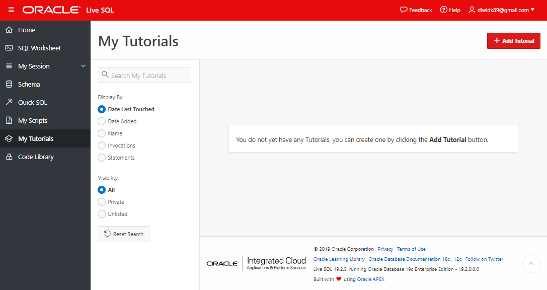 필자는 '가볍게' SQL실습을 위해 Oracle live SQL을 이용하는 터라, My Tutorials 탭을 사용해보지는 않았다.