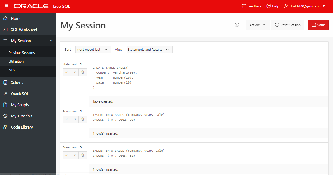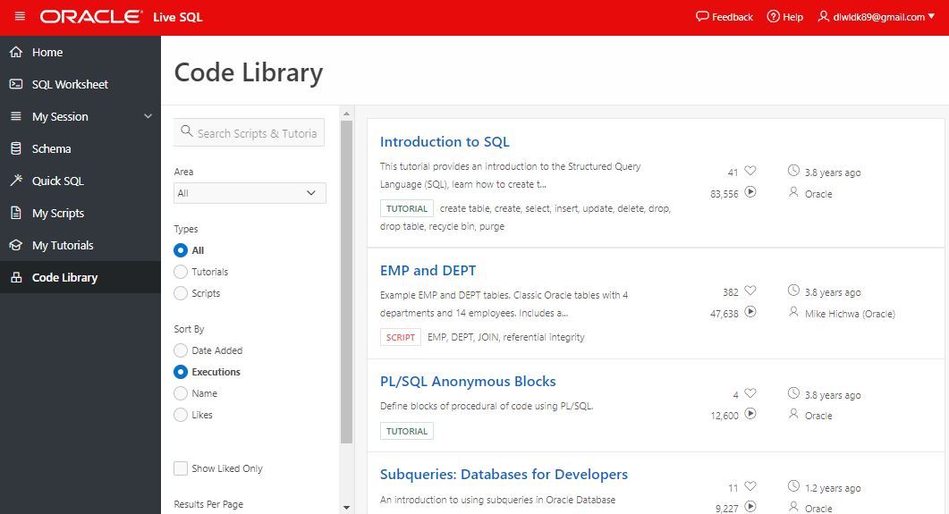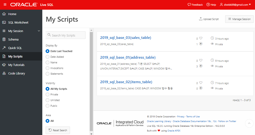 또한 Oracle live SQL 유저들간의 쿼리 공유가 가능하다는 것도 매우 좋은 장점이다.
