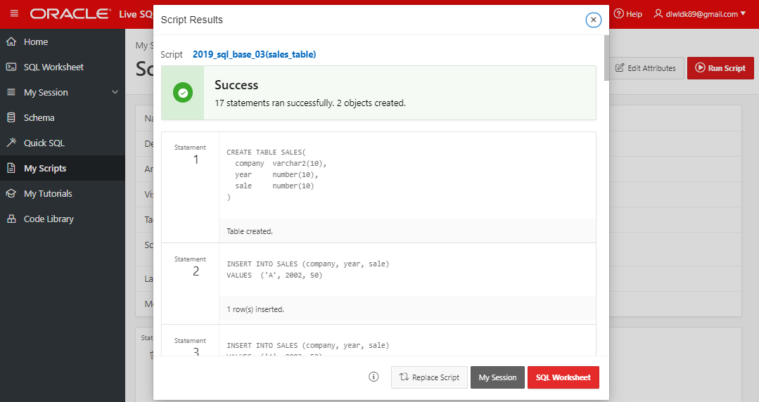 화면에서 Run Script를 누르게 되면 Script에 담겨있는 Statement들이 아래와 같이 실행되고, 실행된 쿼리에 이어서 SQL들을 실행해 볼 수 있도록 SQL Worksheet를 이어주기도 한다.