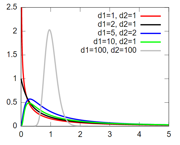 아래 그림은 자유도 d1과 d2에 따른 $F$분포 모양을 나타낸 그래프이다.