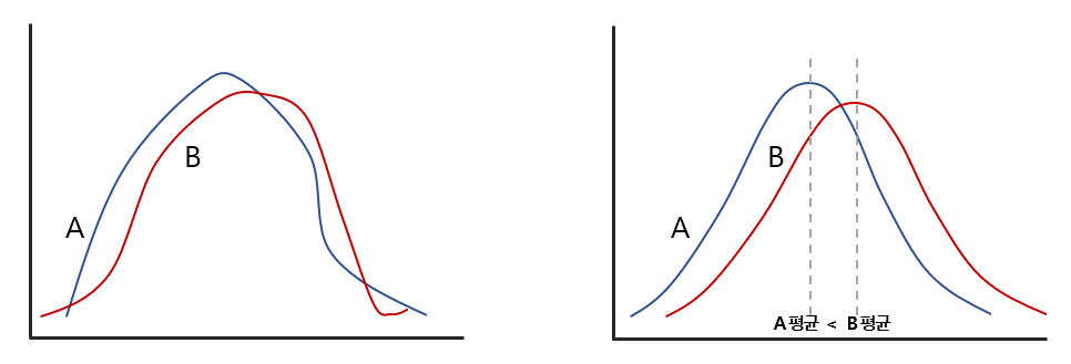 위의 A와 B라는 집단이 있다고 가정할 때, 실제의 분포를 나타낸 그래프로는 한눈에 A와 B의 평균 비교가 어려울 수 있다. 하지만 중심극한 정리를 이용하면 오른쪽과 같이 정규분포 모양으로 분포를 확인할 수 있어 평균의 비교가 용이해진다.