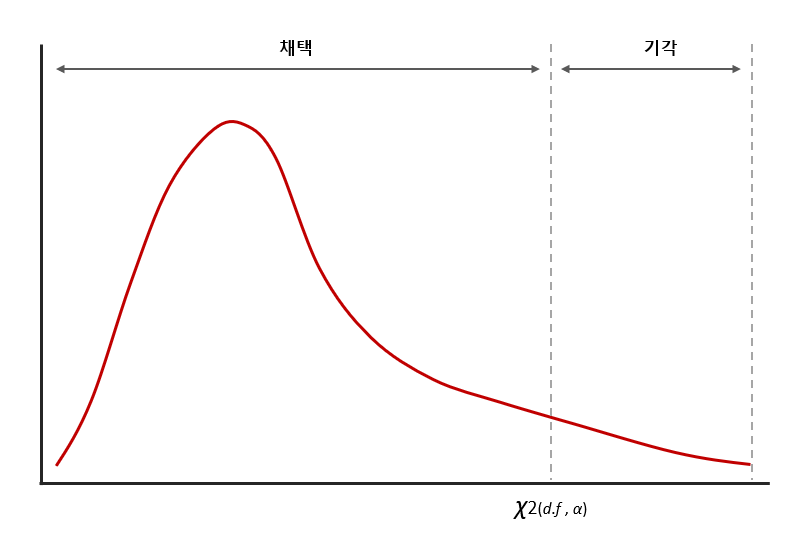 계산된 자유도 d.f(k-1)와 유의수준 $\alpha$를 기준으로 채택역과 기각역을 확인할 수 있다.