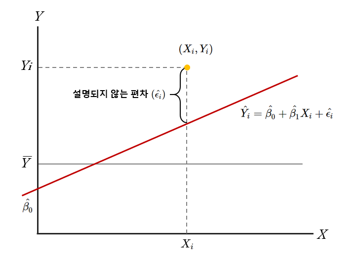 잔차(residual)는 조건부 평균 $E(Y|X) = \beta_0 + \beta_1X_1$이 실제로 측정된 Y와 다르게 나타나는 부분을 의미한다. 잔차가 반영된 회귀식은 아래와 같이 표현한다.