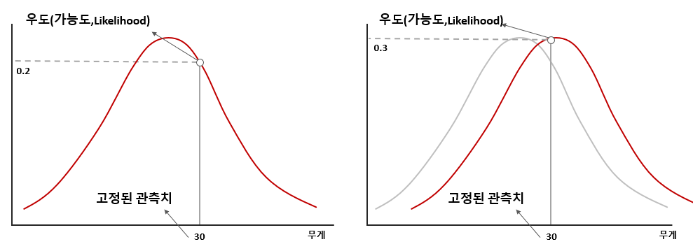 아래 예시를 보면 고정된 관측치는 30kg이고, 이에 대해서 각기 다른 확률밀도함수에 대한 우도를 구할 수 있다. 왼쪽 확률분포에서 관측치 30kg이 나올 확률이 0.2이며, 오른쪽 확률분포에서 관측치 30kg이 나올 확률이 0.3이다. 따라서 관측치 30kg의 경우, 오른쪽 확률밀도함수에서의 우도가 더 크다는 것을 알 수있다. 이런 방식으로 확률로는 비교할 수 없는 것을 우도를 사용함으로써 가능케 한다.