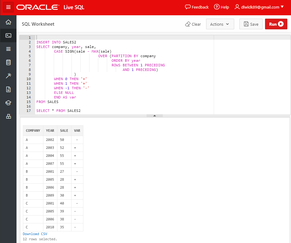 다음은 SALES 테이블에서 회사의 전년도 매출 대비 상승이면 변화(var)가 +, 하락이면 -, 변동이 없으면 =, 전년도 데이터가 없으면 Null을 반환하는 SALES2 테이블을 생성하는 예시이다.
