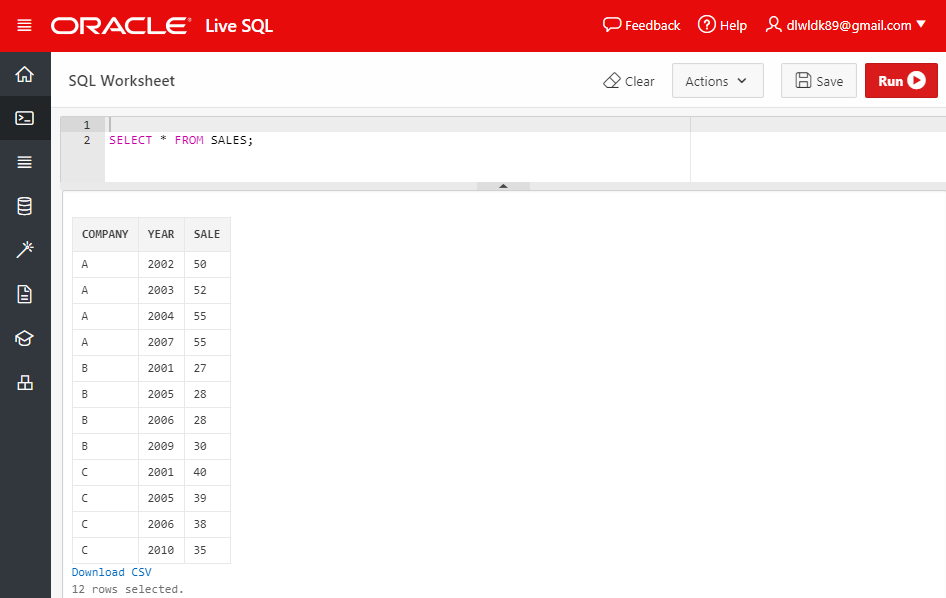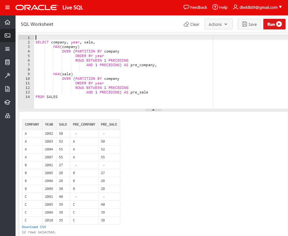 따라서, 다음 예제의 경우 "PARTITION BY company" 및 "ORDER BY year"의 조건이 함께 적용되어, 같은 회사 내의 직전 년도 매출이 반환되는 것이다.