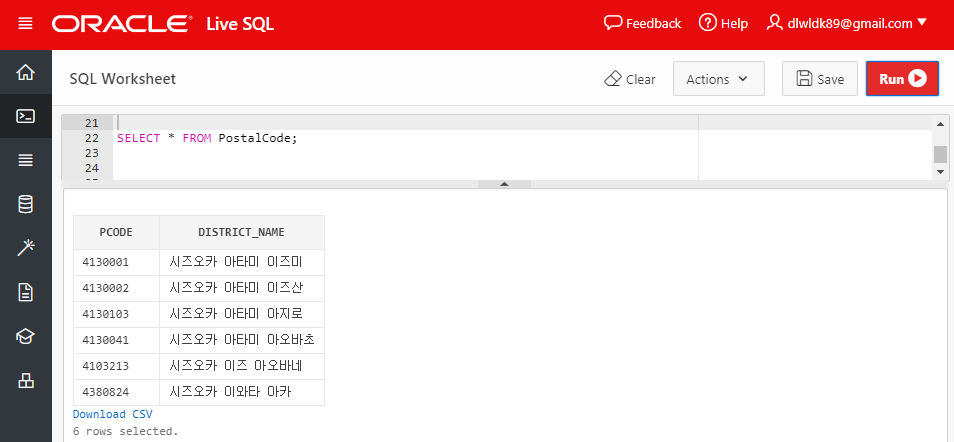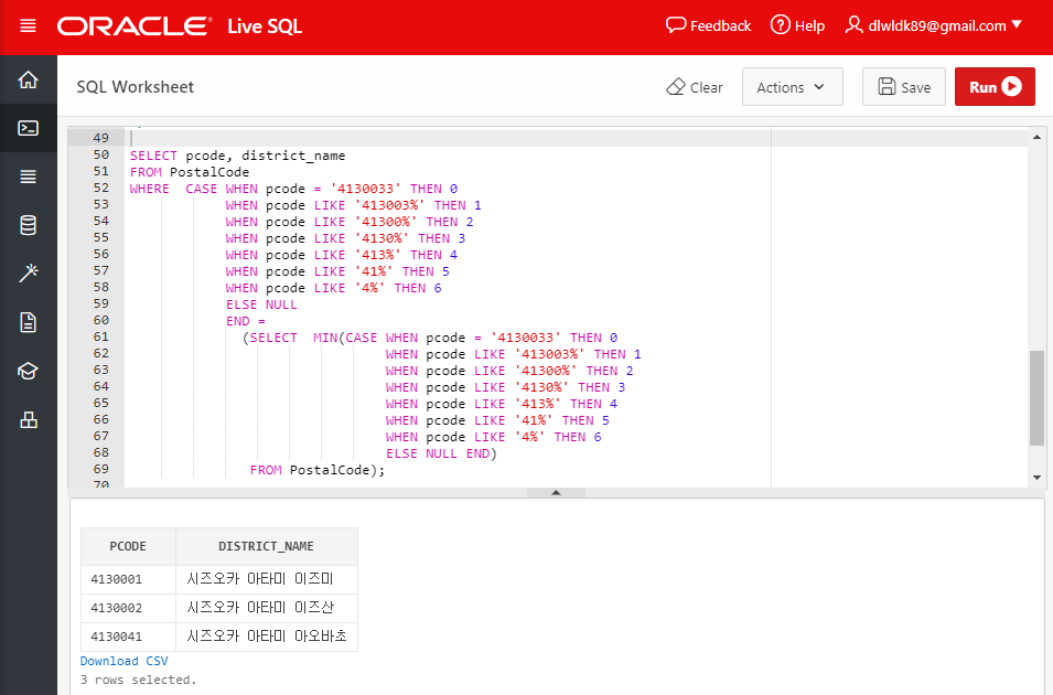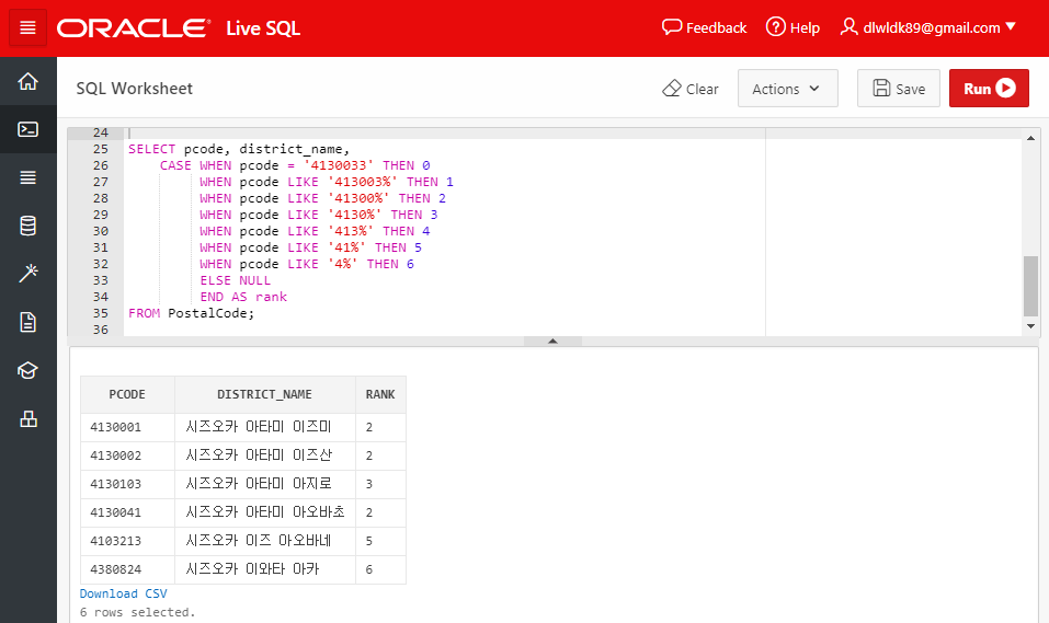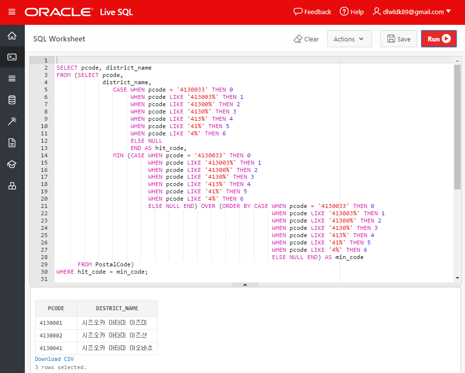 이 예시의 경우는 제시된 [4130033 - 시즈오카 아타미 아타미]의 우편번호와 레코드를 앞자리부터 비교하여 순위를 계산하는 쿼리를 만들어야 한다.