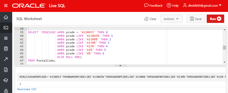 우선, pcode가 4130033과 완벽하게 일치하는 순위를 0으로 시작하여 다음과 같은 쿼리를 작성할 수 있다.
