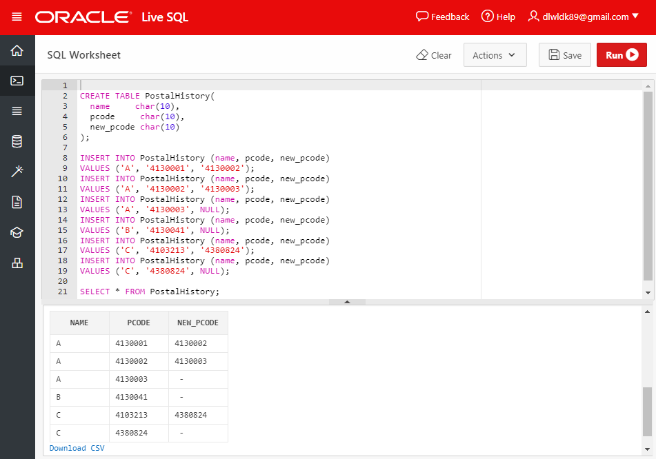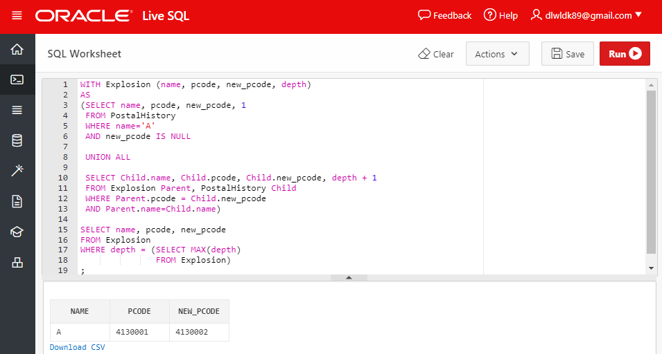 아래의 식은 Oracle에서 제공하는 재귀 공통 테이블 식으로 "A"의 가장 오래된 주소의 우편번호를 검색한 쿼리이다.
