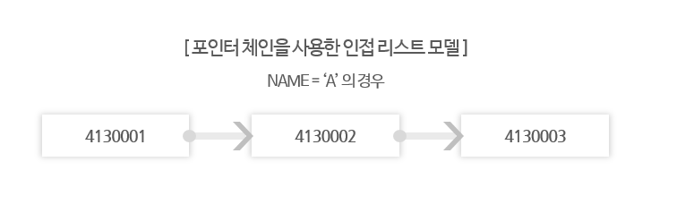 위의 예시처럼, 우체국에서는 오래된 주소로 보내진 우편물을 새로운 주소로 전달하기 위해 위와 같은 방식으로 이력 관리를 한다고 한다. 이렇게 우편번호를 키로 삼아 데이터를 줄줄이 연결한 것을 "포인터 체인"이라 부른다. 또한, 포인터 체인을 활용하여 만든 PostalHistory 같은 테이블 형식을 "인접 리스트 모델"이라고 부른다.