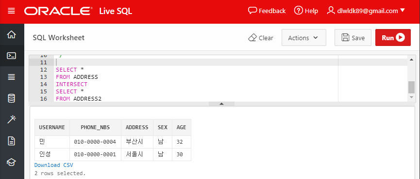 다음은 WHERE 구에서 사용하는 AND 옵션에 해당하는 교집합 INTERSECT의 예시이다.