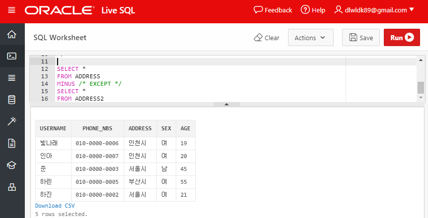 여기서 주의할 점은, UNION이나 INTERSECT 같은 합집합이나 교집합에 대해서는 테이블의 순서가 중요하지 않지만, 앞의 테이블 레코드에서 뒤의 테이블 레코드의 중복을 제거하는 차집합의 경우 테이블의 순서가 중요하다.
