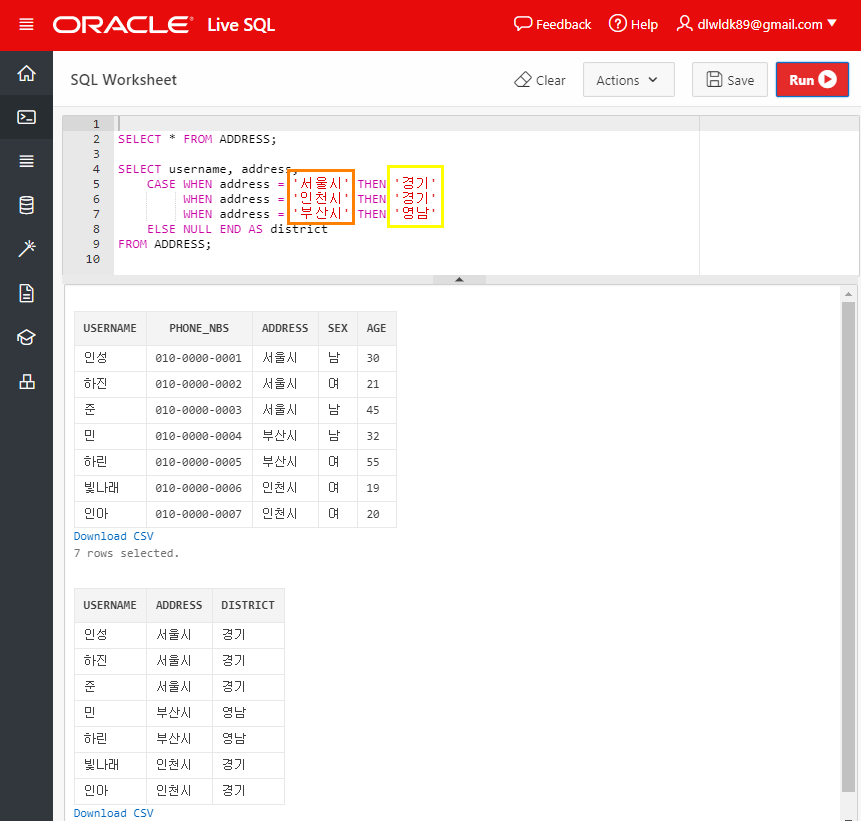아래는 ADDRESS 테이블을 활용하여 CASE 식를 적용한 예시이다. 테이블의 address 컬림이 '서울시'인 경우 DISTRICT는 '경기'로, '부산'인 경우 '영남'으로, '인천'인 경우 '경기'로 값이 만들어지는 조건분기(CASE 식)을 구현했다.