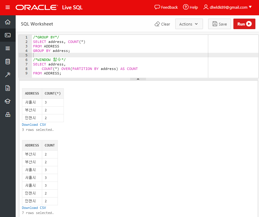 위의 두 쿼리는 address 필드를 기준으로 테이블을 '자르는' 과정은 같으나, GROUP BY 구에서는 잘라서 연산된 레코드를 '집약'하여 결과로 보여준다. 집약 기능이 없는 WINDOW 함수를 사용하면 레코드 수에는 변함이 없다.