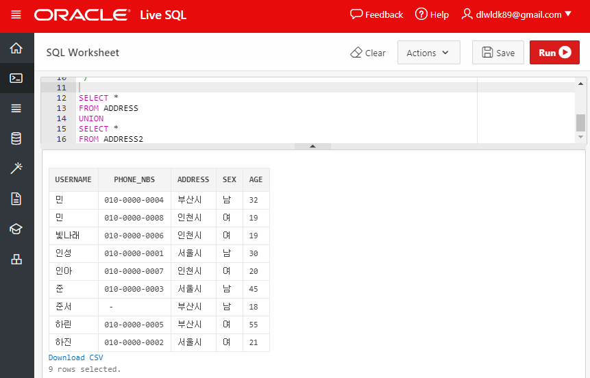 아래는 테이블 구조가 같은 두개의 테이블 (ADDRESS, ADDRESS2) 의 합집합을 구하는 과정이다. UNION은 WHERE 구에서 사용하는 OR 옵션과 같은 역할을 한다. 테이블이 합해지는 과정에서 중복되는 두 레코드인 'username:인성/address:서울시'와 'username:민/address:인천시'의 중복을 제거한다.