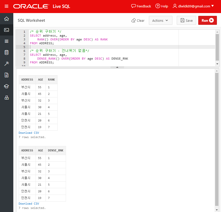 RANK 함수는 AGE가 같으면 같은 순위를 표시해주며, DENSE_RANK 함수를 사용하게 되면 순위가 건너뛰는 작업 없이 순위가 매겨진다.